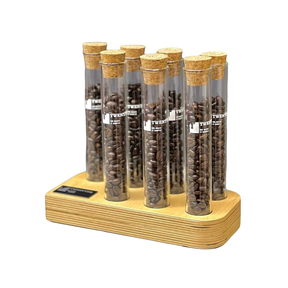استند دوزینگ قهوه خانگی Twenty20 مناسب برای نگهداری دوز قهوه موردنیاز برای هر بار تهیه قهوه و جلوگیری از اکسیداسیون مابقی دان قهوه در اثر مجاورت با هوا می‌باشد. این استند از یک پایه چوبی به همراه 7 محفظه (ویال) شیشه‌ای با ظرفیت حجمی هر کدام 32 گرم تشکیل شده است.