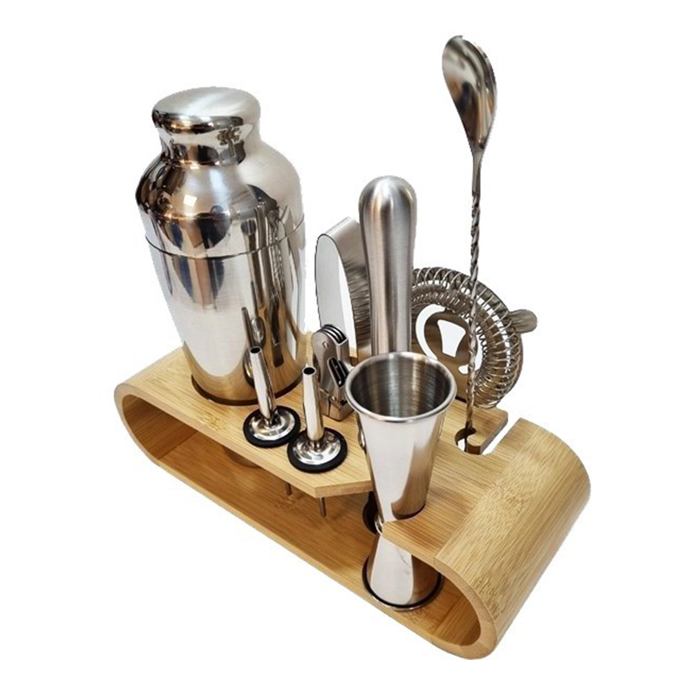 - این ست شامل یک عدد شیکر کوبلر ،یک عدد جیجر ، یک عدد بارسپون ،یک عدد مادلر ،یک عدد استرینر ، یک عدد انبر ،دو عدد سر سیروپ (آرام ریز) و یک عدد در بازکن می باشد.