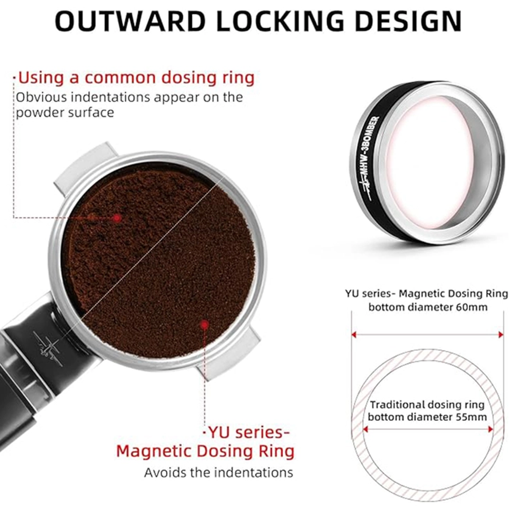 فانل سایز 58.35 میلی متر با طراحی مغناطیسی رینگ دوزینگ با استفاده از خاصیت مغناطیسی به سادگی بر روی پرتافیلتر نصب میشود و از جابجایی آن جلوگیری میکند. فانل پرتافیلتر بمبر مدل YU Series Magnetic Funnel از لوازم جانبی اسپرسو ساز بسیار مفید است که از هدر رفتن قهوه یا لکه دار شدن نوار جلوگیری می کند. استفاده از فانل مگنتی بمبر براحتی سطح تماس و ارتفاع را افزایش و به پودر قهوه اجازه می دهد تا به راحتی وارد سبد شود و تا حد زیادی از آشفتگی و دردسر درست کردن قهوه بکاهد.با استفاده از این دوزینگ رینگ، از ریزش پودر قهوه به بیرون از پرتافیلتر جلوگیری میشود و به شما این امکان را میدهد که دوز دقیقی از قهوه را استفاده کنید.فانل قهوه یکی از لوازم جانبی بسیار کاربردی است که از هدر رفتن قهوه و ایجاد کثیفی در محیط کار جلوگیری میکند. استفاده از فانل باعث افزایش سطح تماس و ارتفاع میشود و اجازه میدهد پودر قهوه بهراحتی وارد بسکت شود و بهطور قابلتوجهی کثیفی و دردسر فرآیند عصارهگیری را کاهش دهد. حلقه اندازه گیری قهوه اسپرسو 58 میلی متری از آلیاژ آلومینیوم با کیفیت بالا ساخته شده است که به راحتی زنگ نمی زند یا خورده می شود و می توان برای مدت طولانی از آن استفاده کرد.