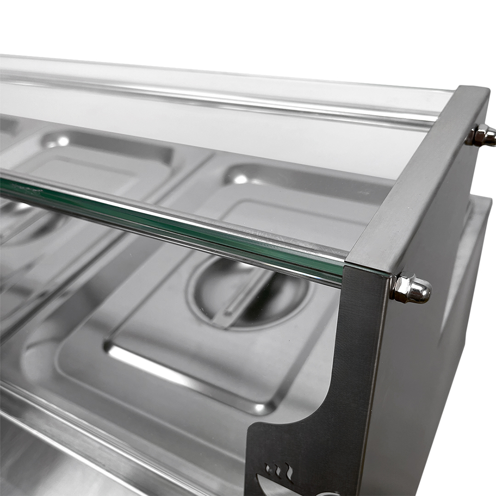 هات بنماری رومیزی با رف شیشه ای ۳ لگنه یکی از بهترین ارکان تجهیزات سرو غذا می باشد. حتما دیدید که در هتل ها و تالار های پذیرایی و بسیاری از رستوران ها سرو غذا به صورت سلف سرویس صورت می گیرد و همچنین این روش علاوه بر جلب توجه مشتری، اصراف غذایی نیز صورت نمی گیرد چرا که هر مشتری به اندازه ظرفیت خود غذا می کشد. همچنین در قسمت آشپزخانه نیز بسیار کاربرد دارد تا تفکیک مواد اولیه به درستی صورت گیرد.